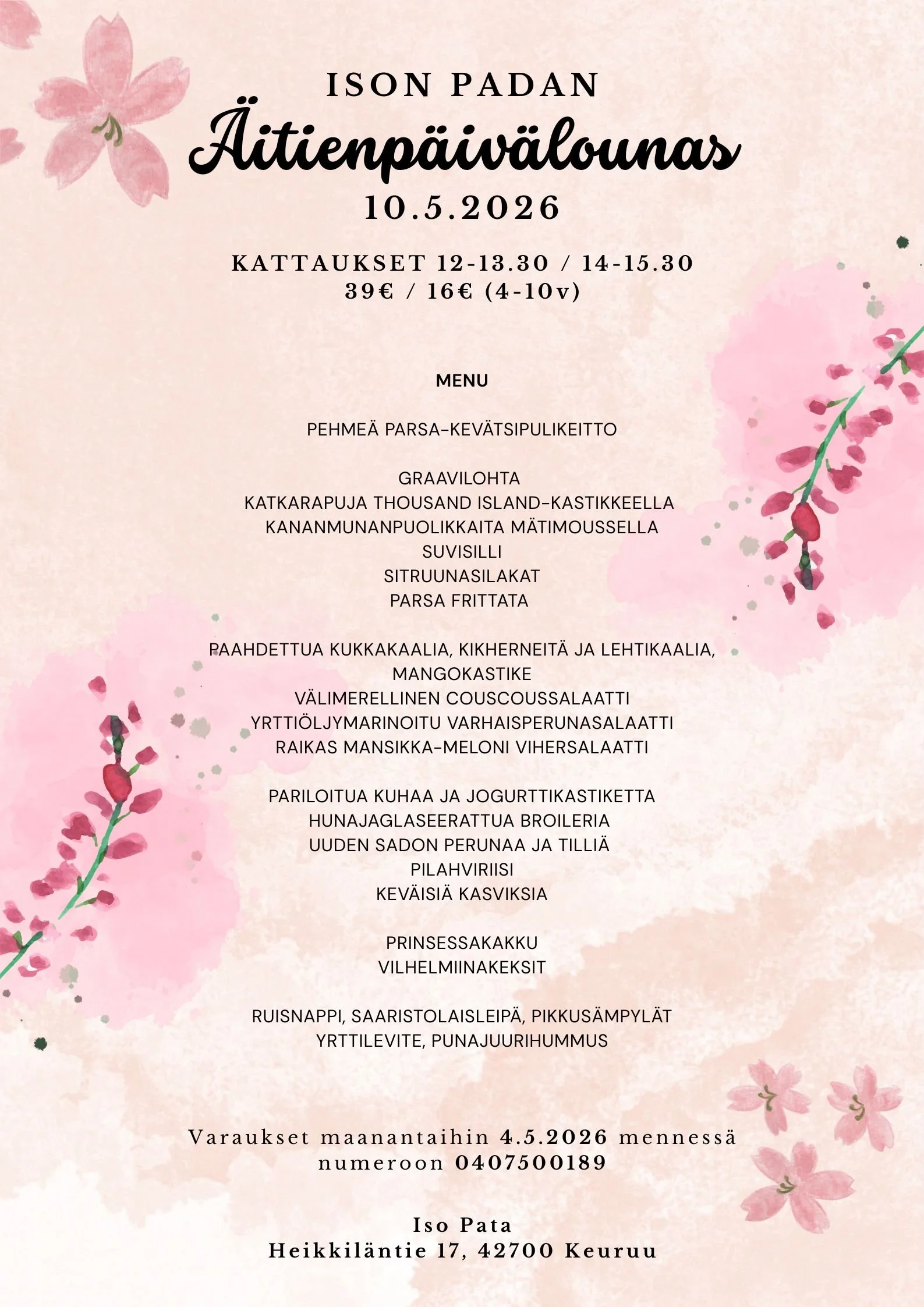 Äitienpäivälounaan 10.5.2026 varaukset 4.5. mennessä numeroon 040-7500189.